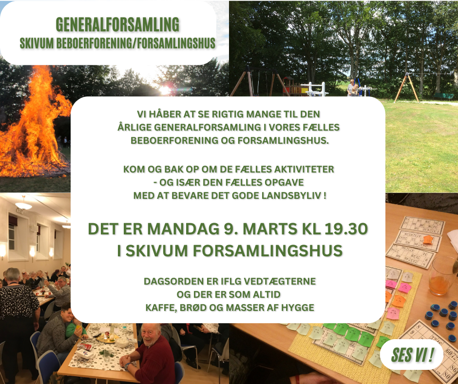 Mandag 9 marts kl 19.30 Generalforsamling for Skivum Beboerforening og Forsamlingshus